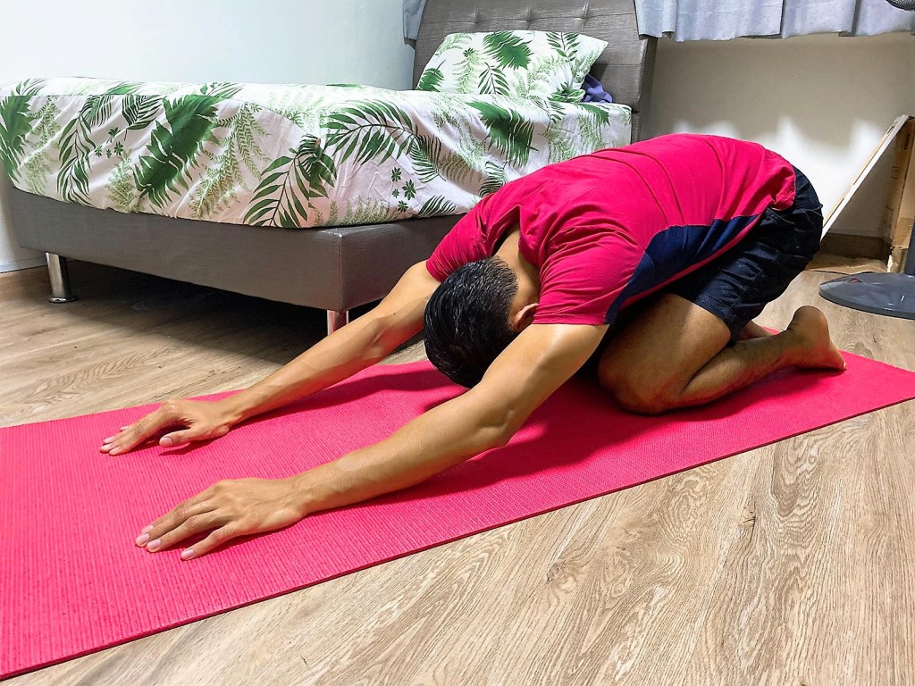 Move your hands forward and try to bring your glutes to your feet. You will feel a gentle stretch in the lower back. You can hold this position for about half a minute to a minute. It should feel quite relaxing.