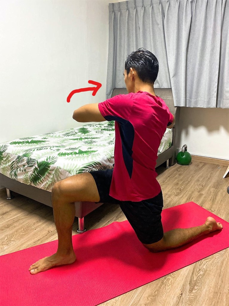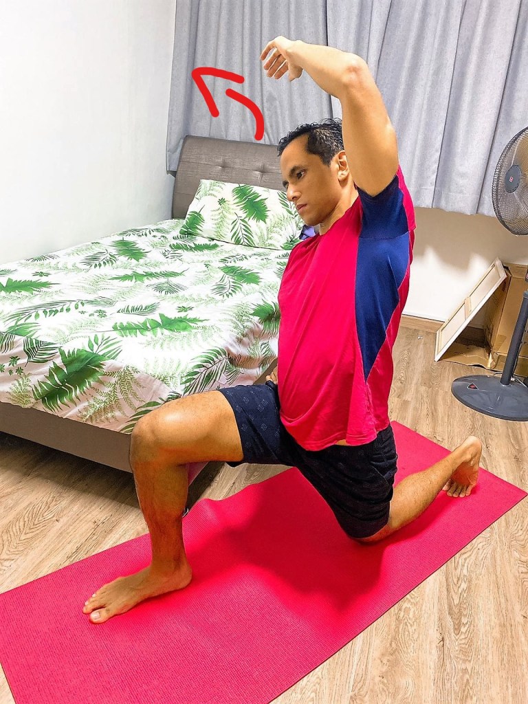 One thing to take note: The front leg is about 90 degrees and the back leg is at more than 90 degrees. We do not want to be in lunge form whereby we are at almost 90 degrees for both legs.
